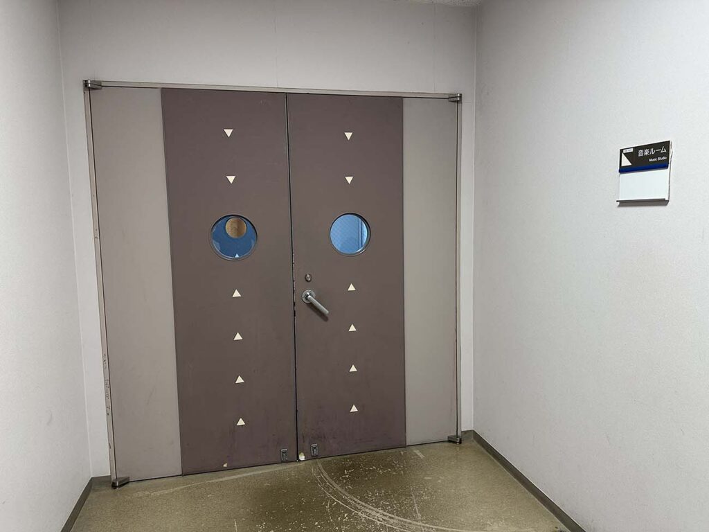 | 音楽ルーム | 広いお部屋で74㎡もあり、講演会や小規模な発表会を行うことはできるそうですが、有料公演はできないそうです。 縦長の部屋で、片側の壁面には約5mの全面鏡がありました。扉は2重扉で防音になっていましたが、1Fの廊下から音楽ルームで演奏している曲が流れていました。 館内にWifiがあるのですが、この部屋はWifiが入りません。インターネットが使えなくて、ちょっと困りました。 |